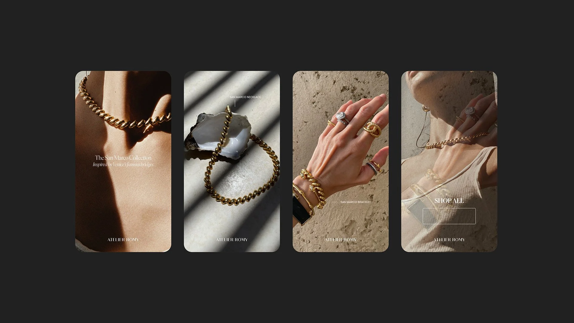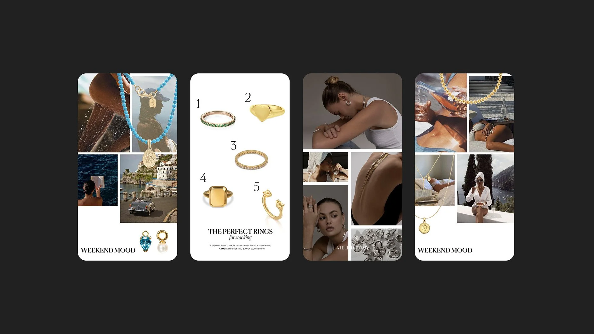 Social media content creation for Atilier Romy who offer everlasting classic, yet strong jewellery that stays in style. This project included creation of Instagram stories, in feed posts and newsletters for the client.